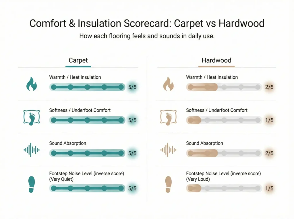 | Comfort | Soft, warm, cozy, sound-absorbing, comfortable for kids & seniors. | Harder, naturally cold, louder footsteps. |