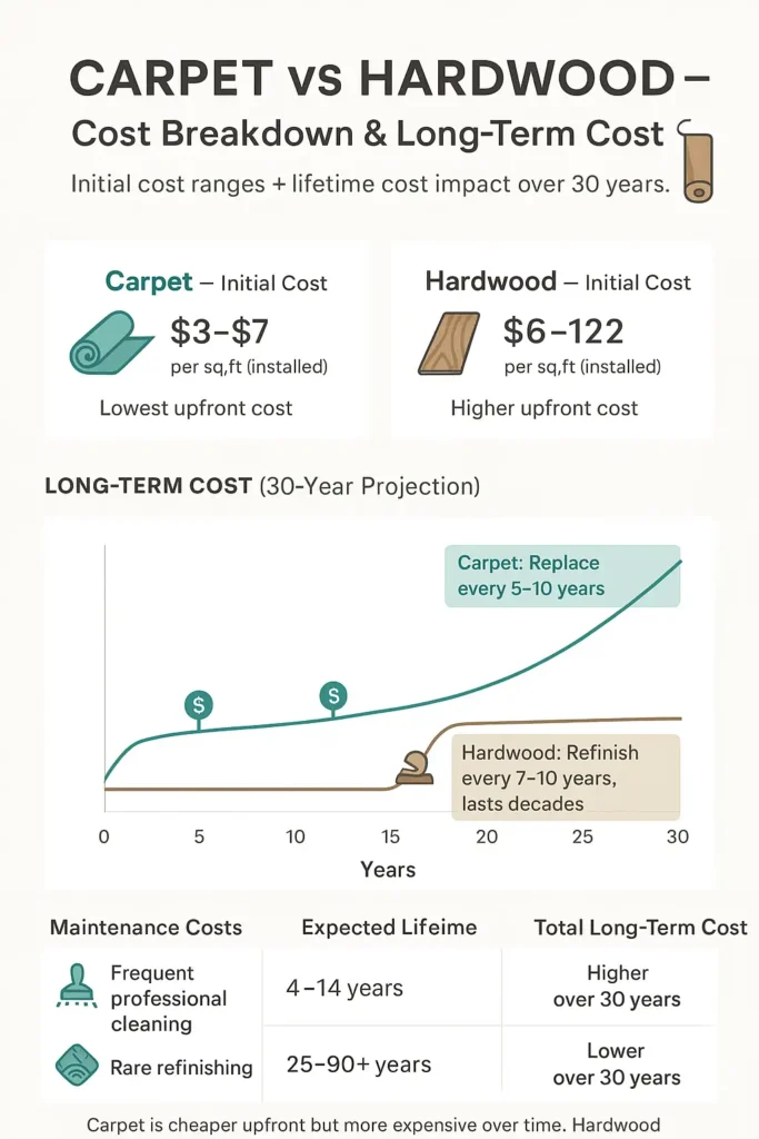 Carpet offers a budget-friendly option with costs ranging from $3 to $7 per square foot, including installation. Hardwood is pricier, generally between $6 to $12 per square foot, with high-end types exceeding these costs. While hardwood’s initial expense is higher, its longevity and potential increase in home resale value often make it a wiser investment. Consider both immediate and long-term costs, factoring in installation, maintenance, and future value in your budget.