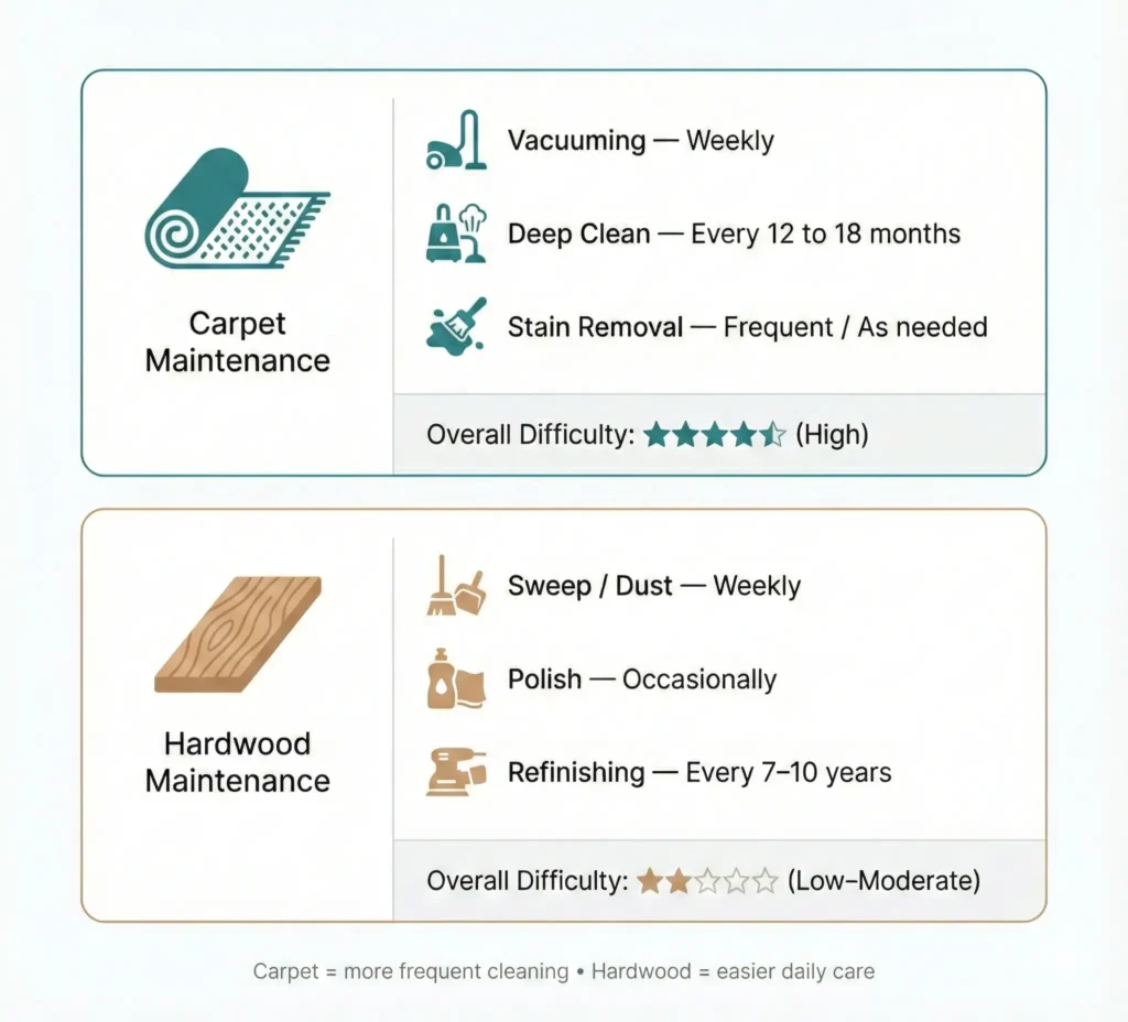 When choosing between carpet and hardwood flooring, understanding the maintenance and cleaning requirements is pivotal. This decision not only affects your ongoing household chores but also impacts the longevity and appearance of your floors. Let’s explore how maintaining each type of flooring can fit into your lifestyle.