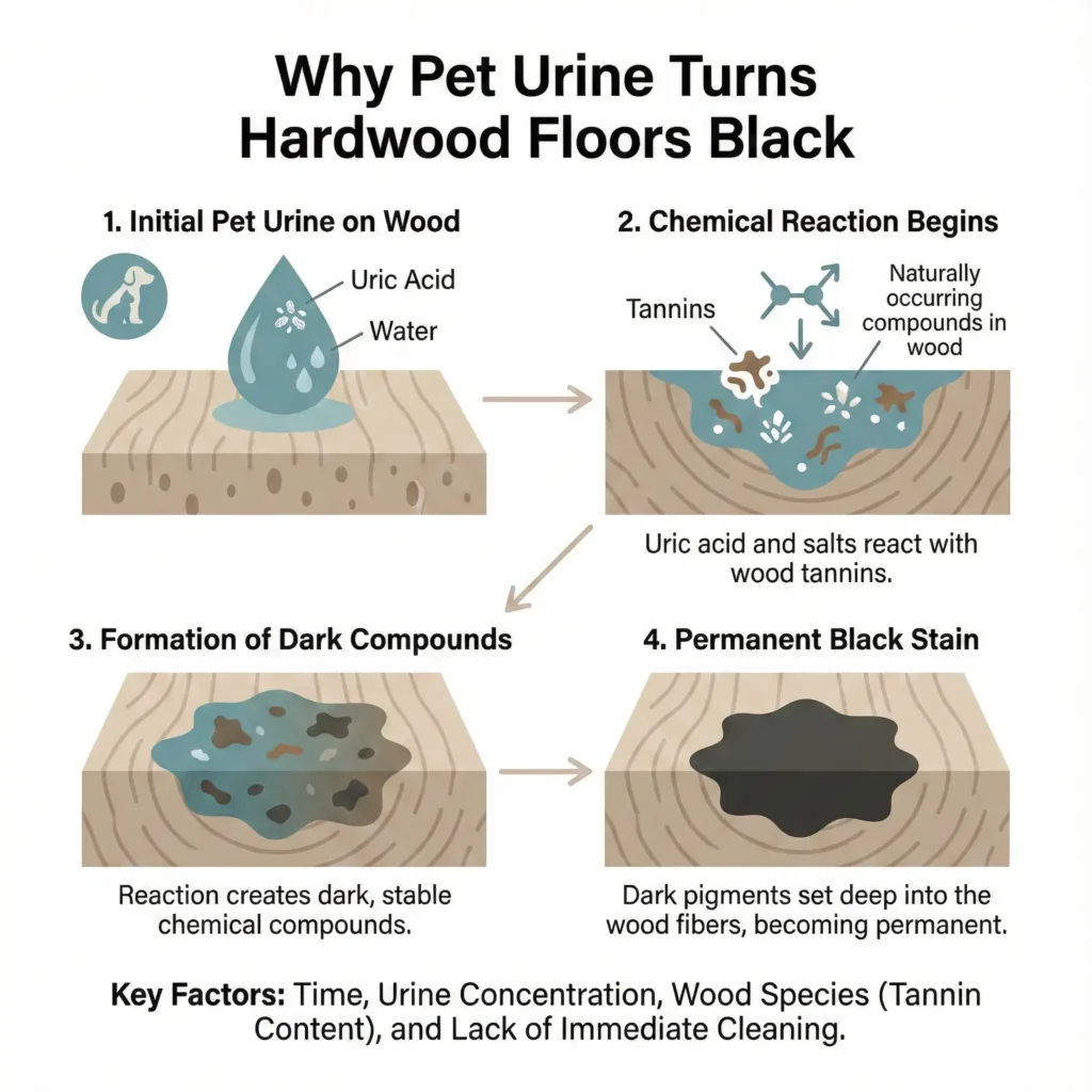 As urine dries, uric acid crystals form deep inside the wood fibers. These crystals reactivate with moisture and continue releasing ammonia and mercaptan odors long after the surface looks “clean.”